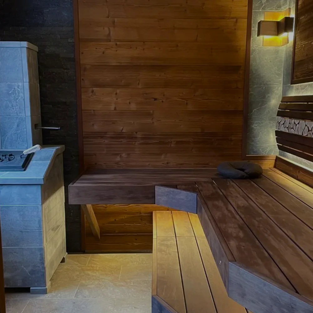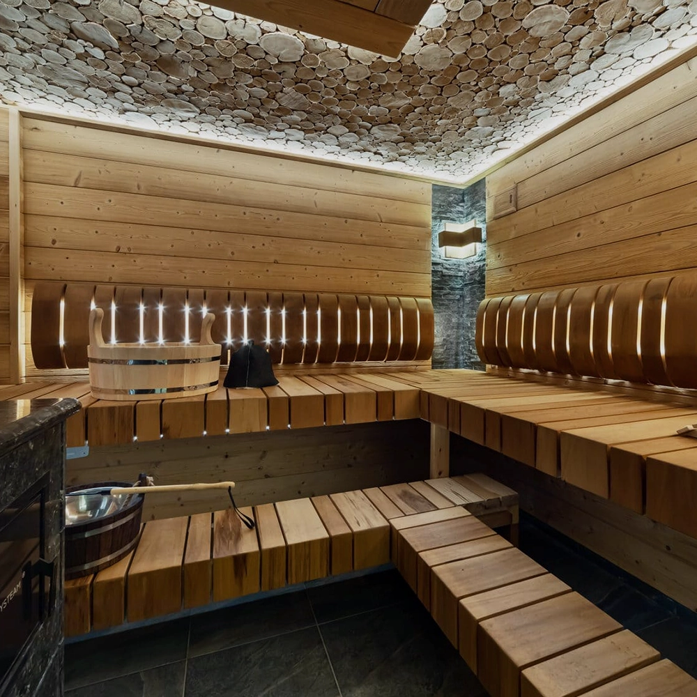 Парная из ольхи, с печью Easysystem «Сочи-2», c талькомагнезитом Tulikivi и освещением «Звёздное небо»