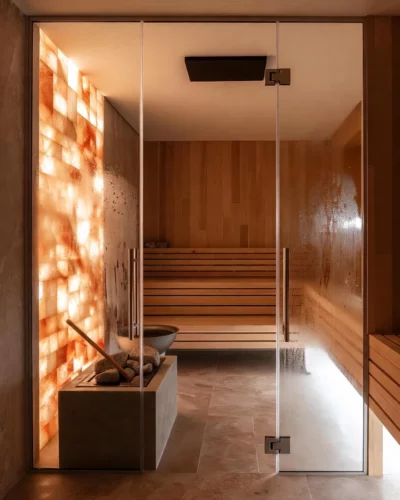 Парная из термоели, с печью Easysystem «Ялта» и акцентами из натурального камня и можжевельника