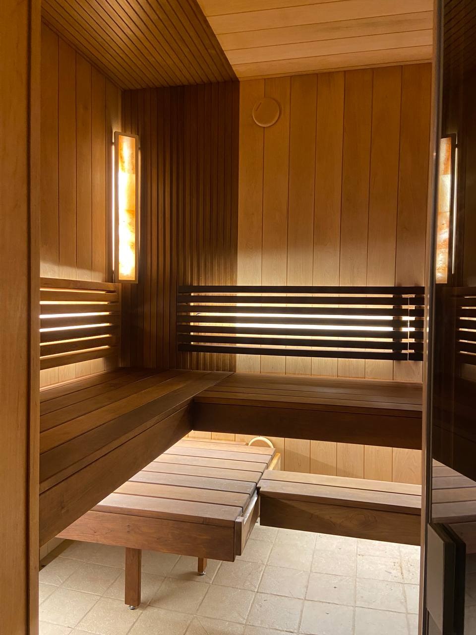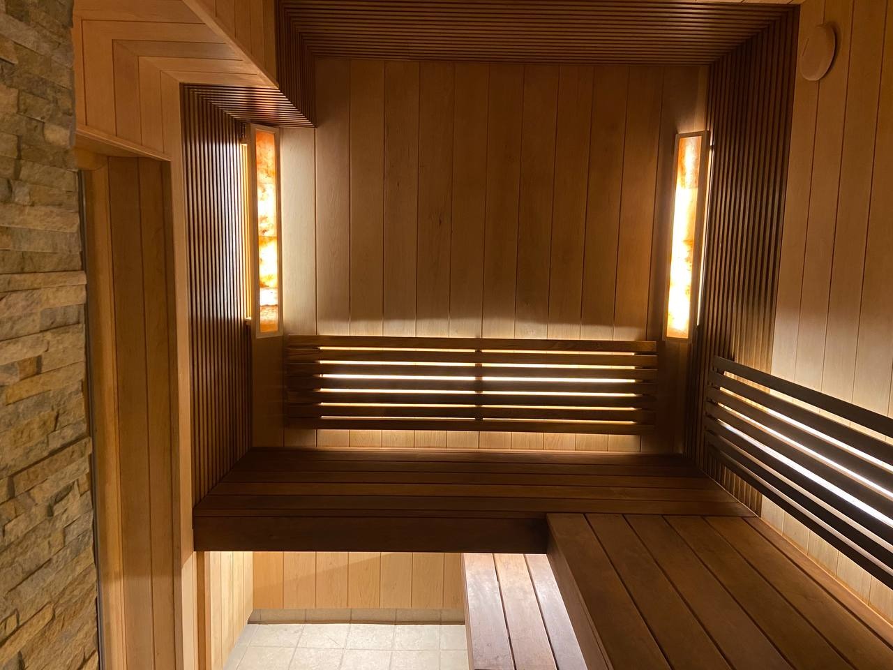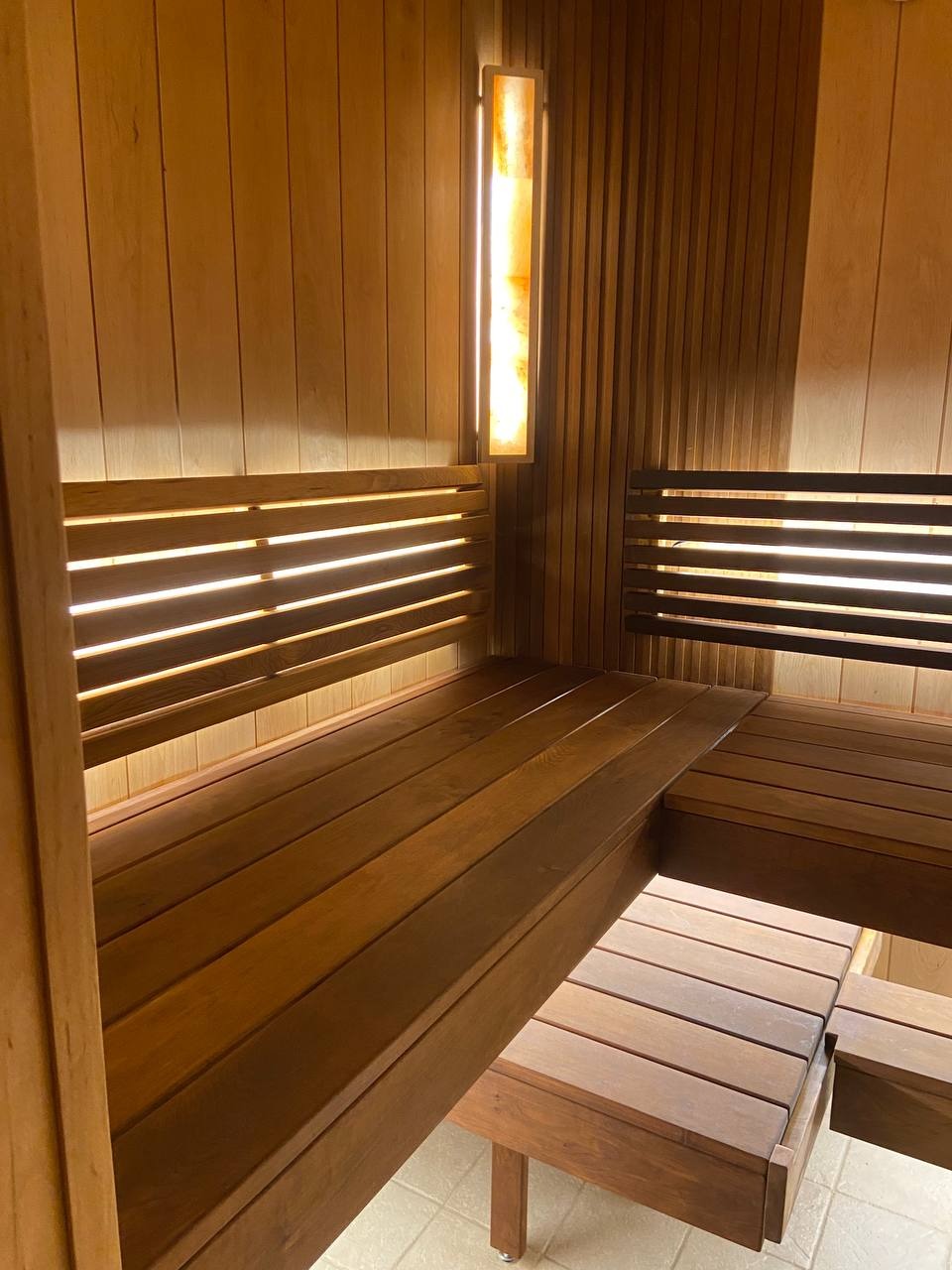 Главной световой доминантой и арт-объектом становятся светильники из гималайской соли в авторской светлой рамке. Их тёплое, живое свечение, проходящее сквозь природный кристалл, создаёт на стенах из чёрной ольхи уникальные переливы, похожие на отблески заката на воде, наполняя парную целебными микроэлементами и успокаивающей энергетикой.