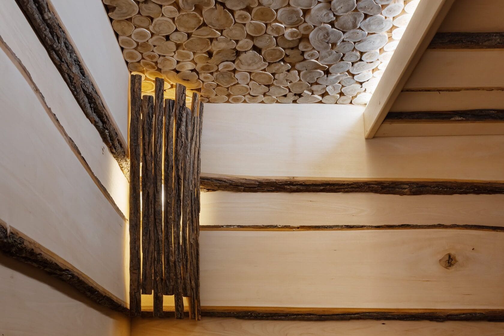 В проекте использована натуральная древесина с выраженной фактурой и природные материалы для создания тёплой, аутентичной атмосферы.