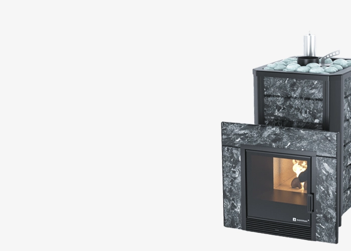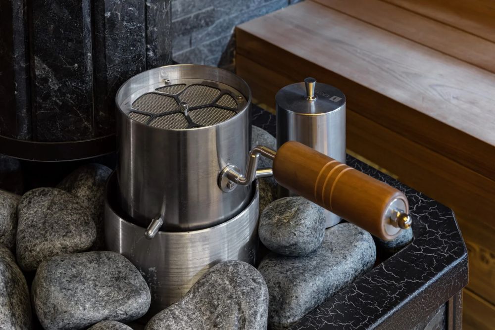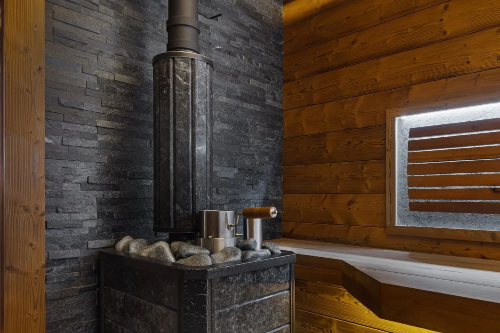 Парная с брашированной термоелью, печью Easysystem «Ялта» и акцентами из натурального камня и можжевельника для стильного и комфортного отдыха