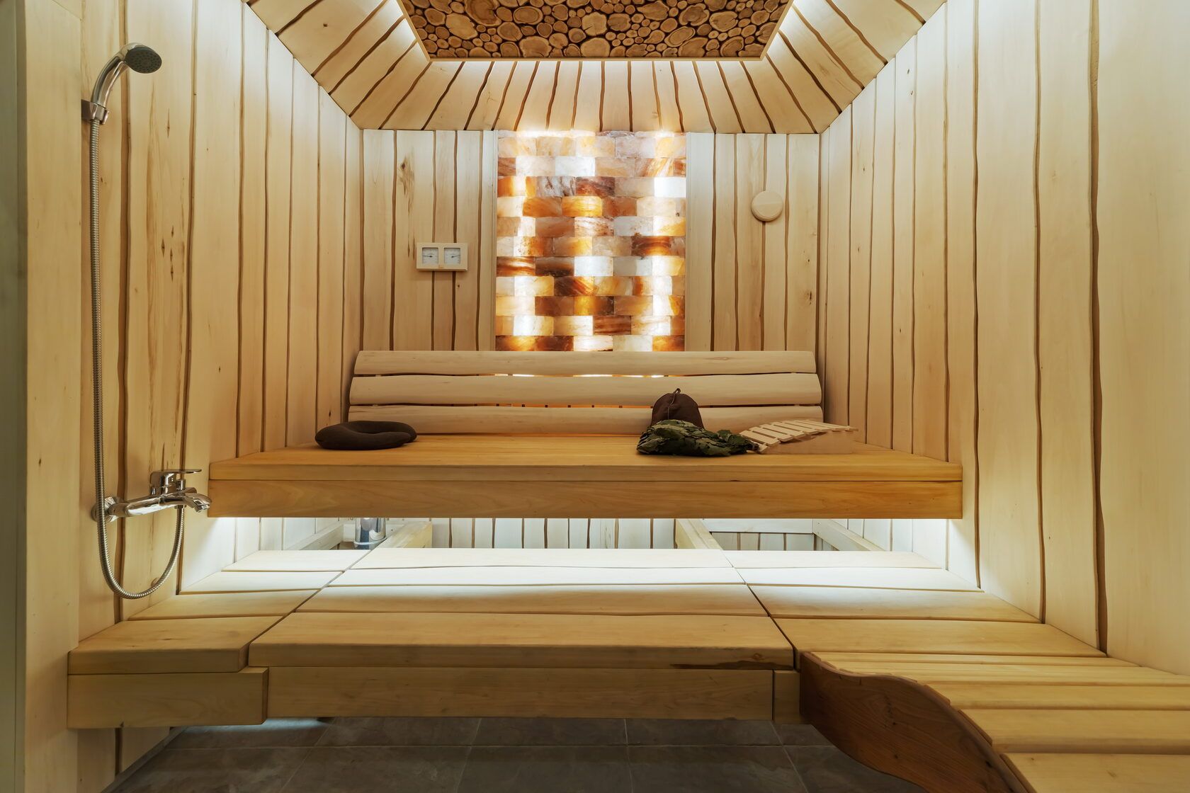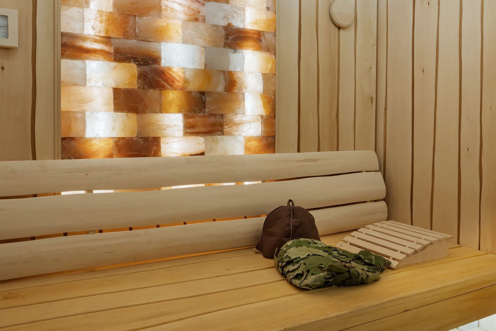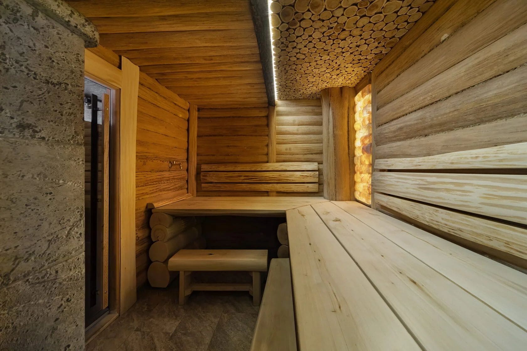 Парная с отделкой из липы волна, печью «Атмосфера L», соляным панно и системой «Второе дыхание» для идеального микроклимата