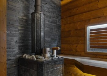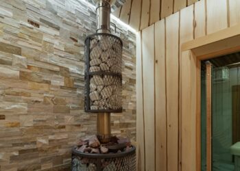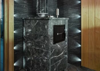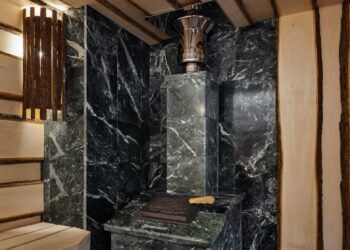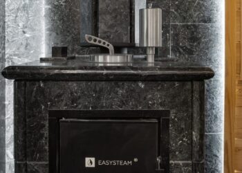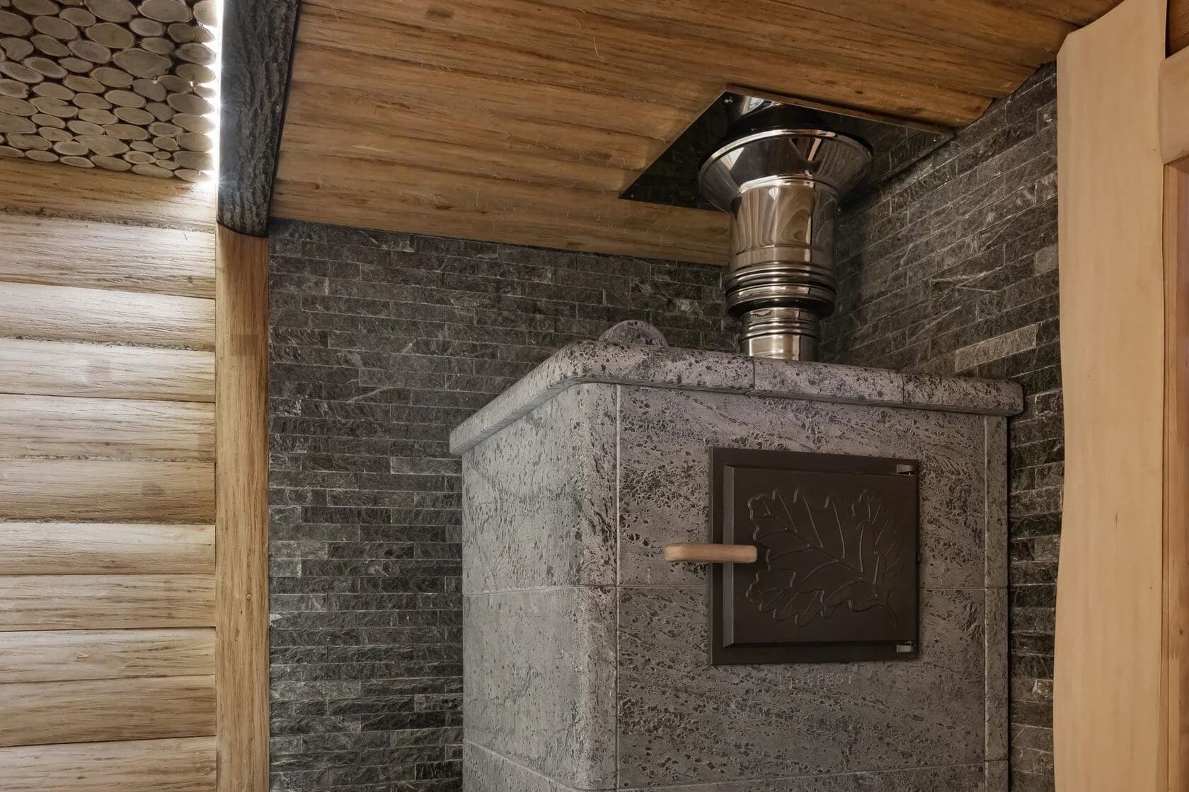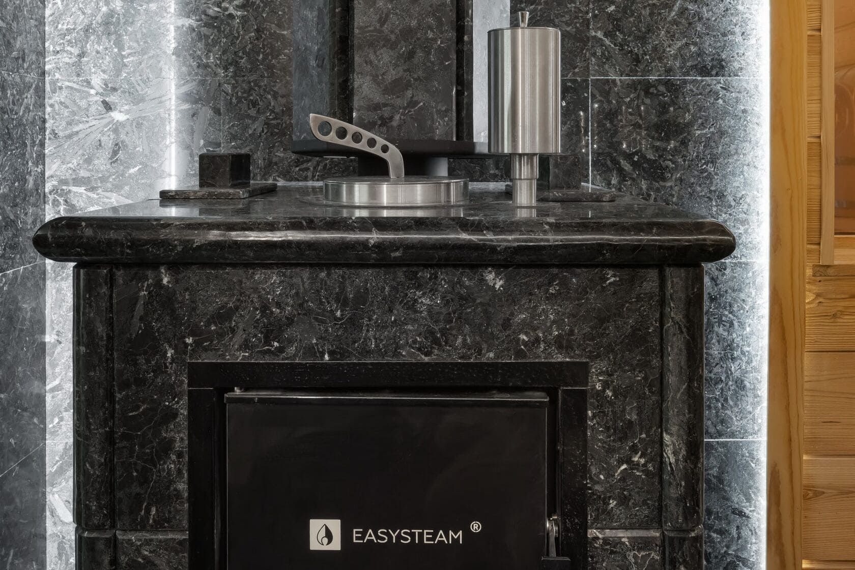 Парная с брашированной термоелью, печью Easysystem «Ялта» и акцентами из натурального камня и можжевельника для стильного и комфортного отдыха