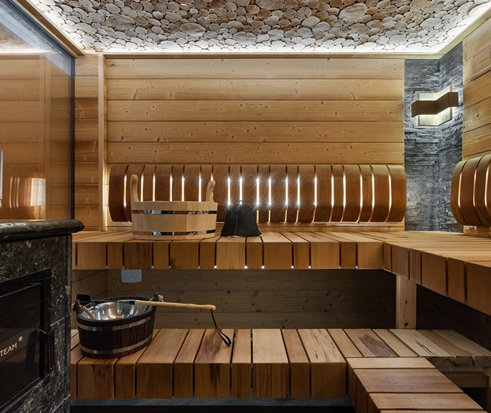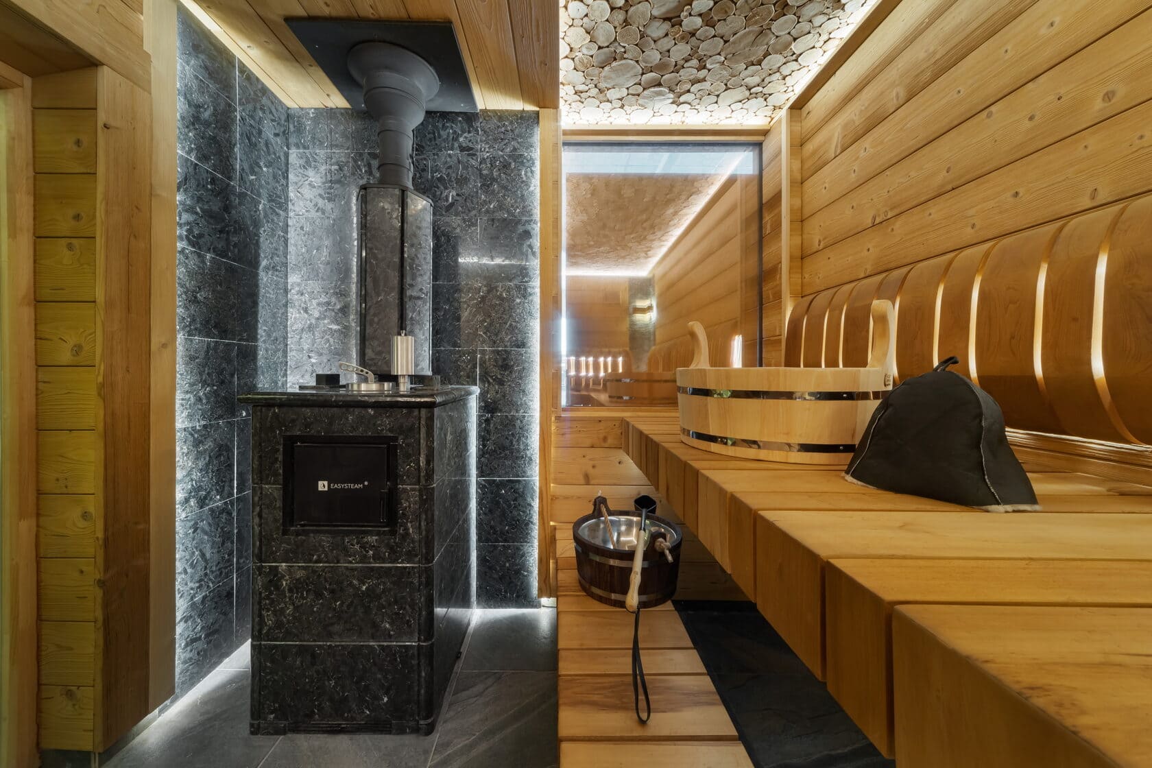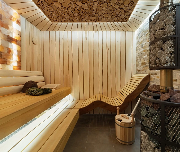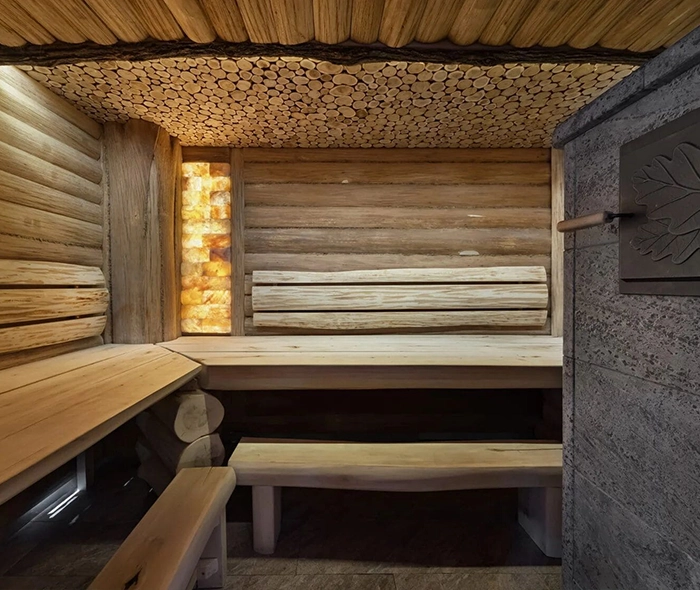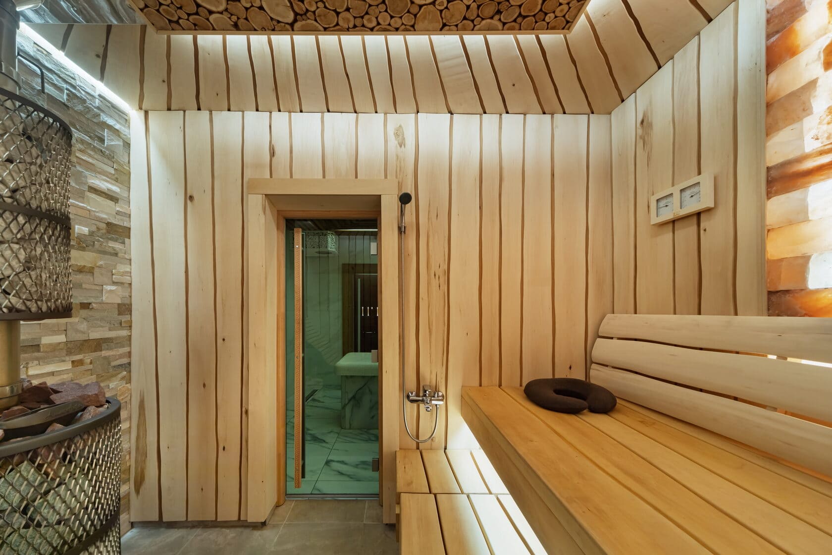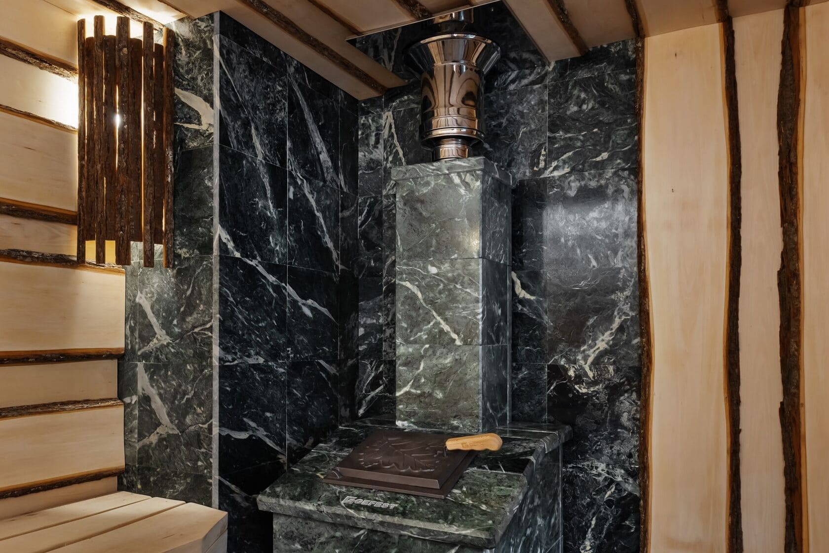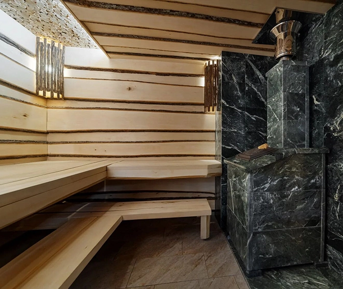Парная с отделкой из слэба липы с корой, печью GFS и природными акцентами из можжевельника и гималайской соли