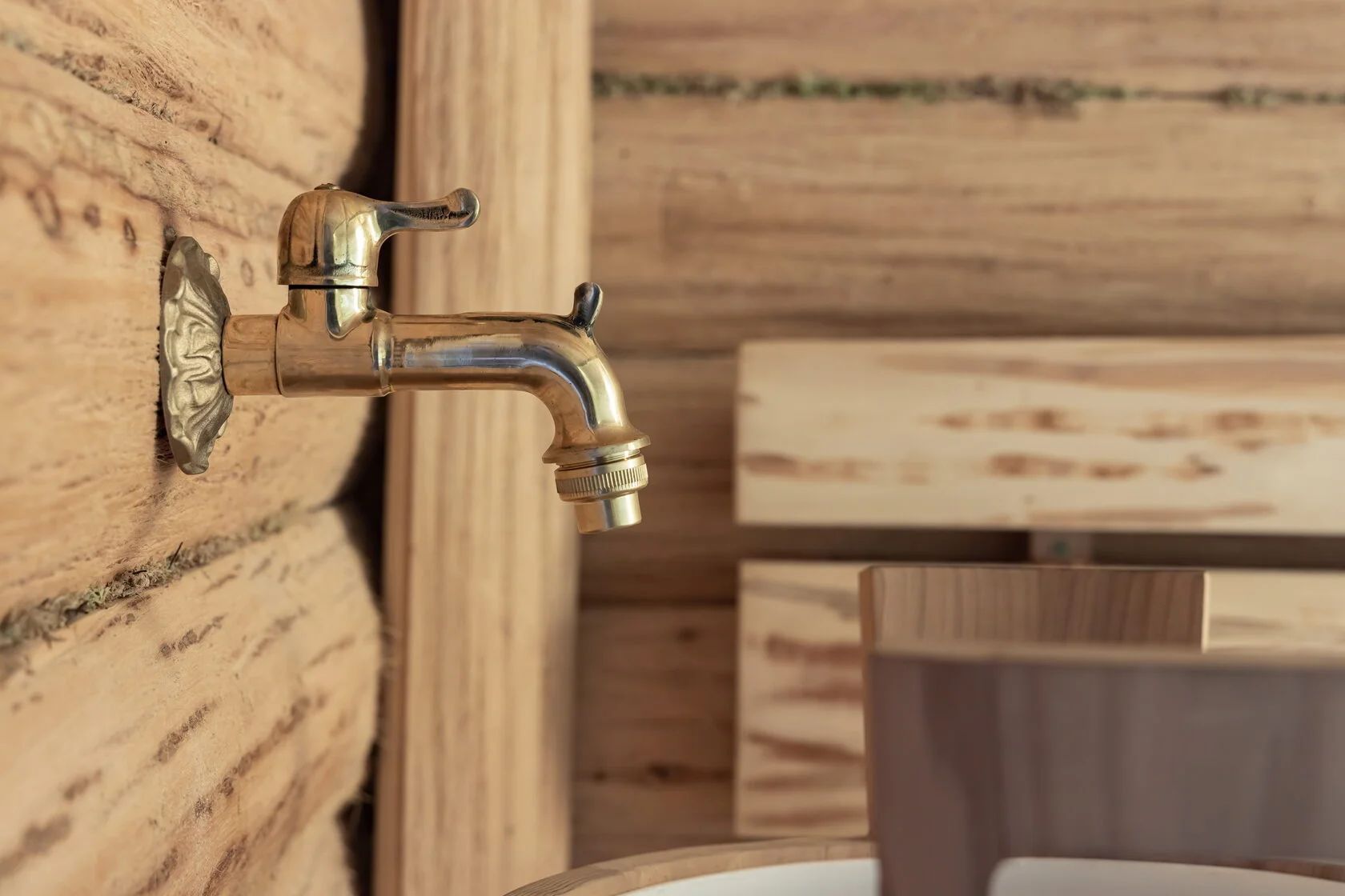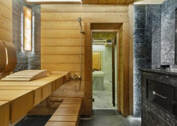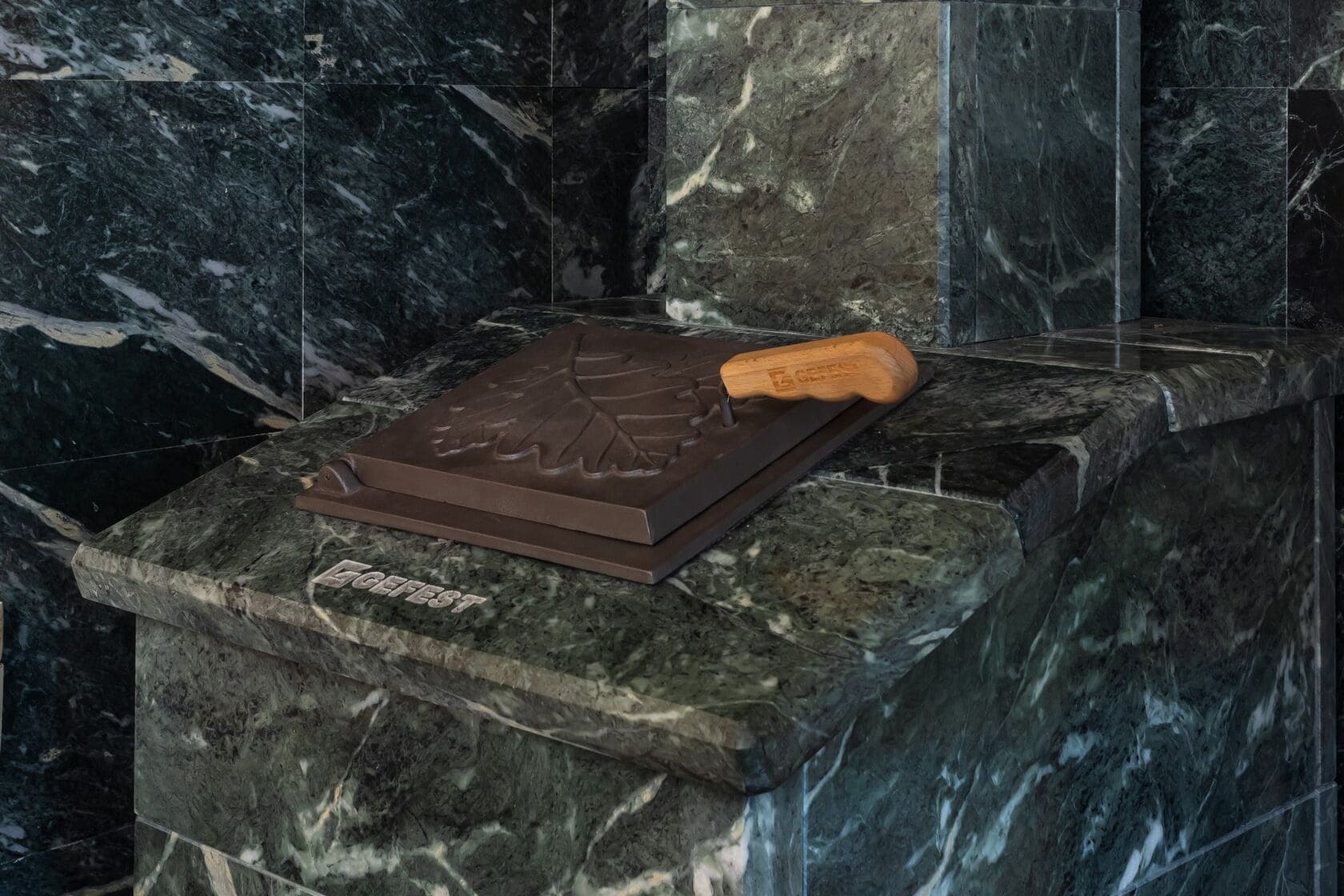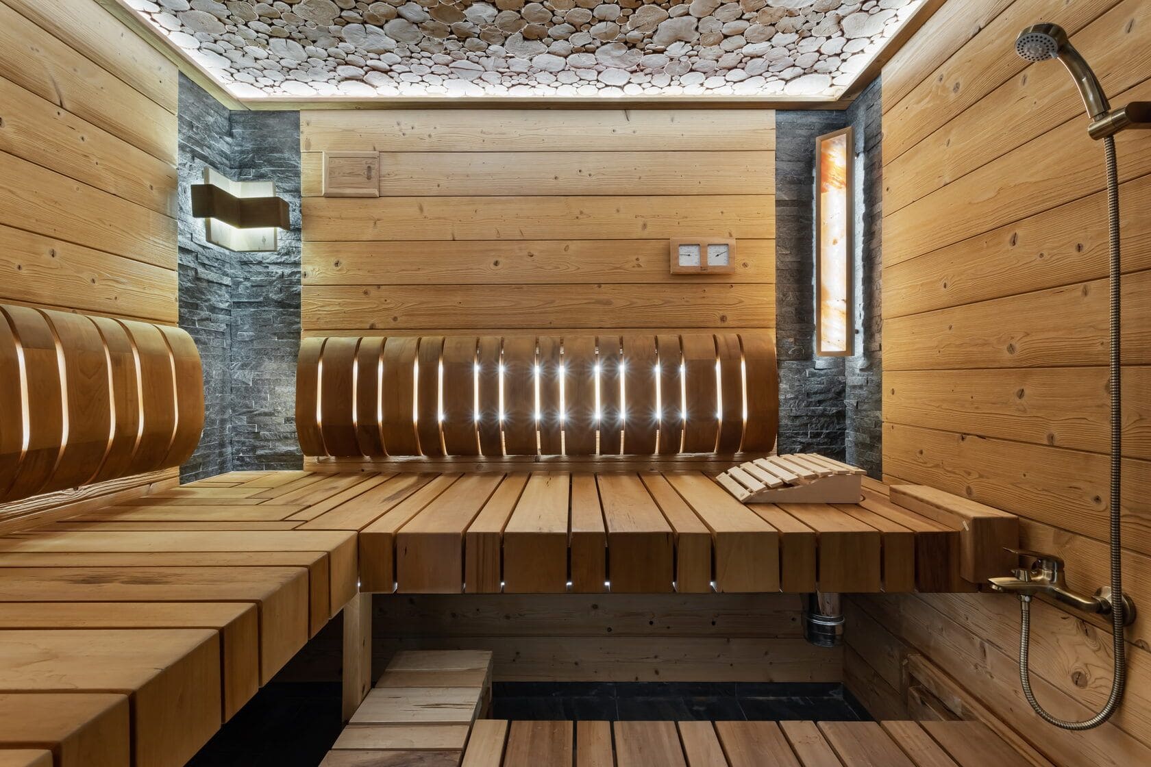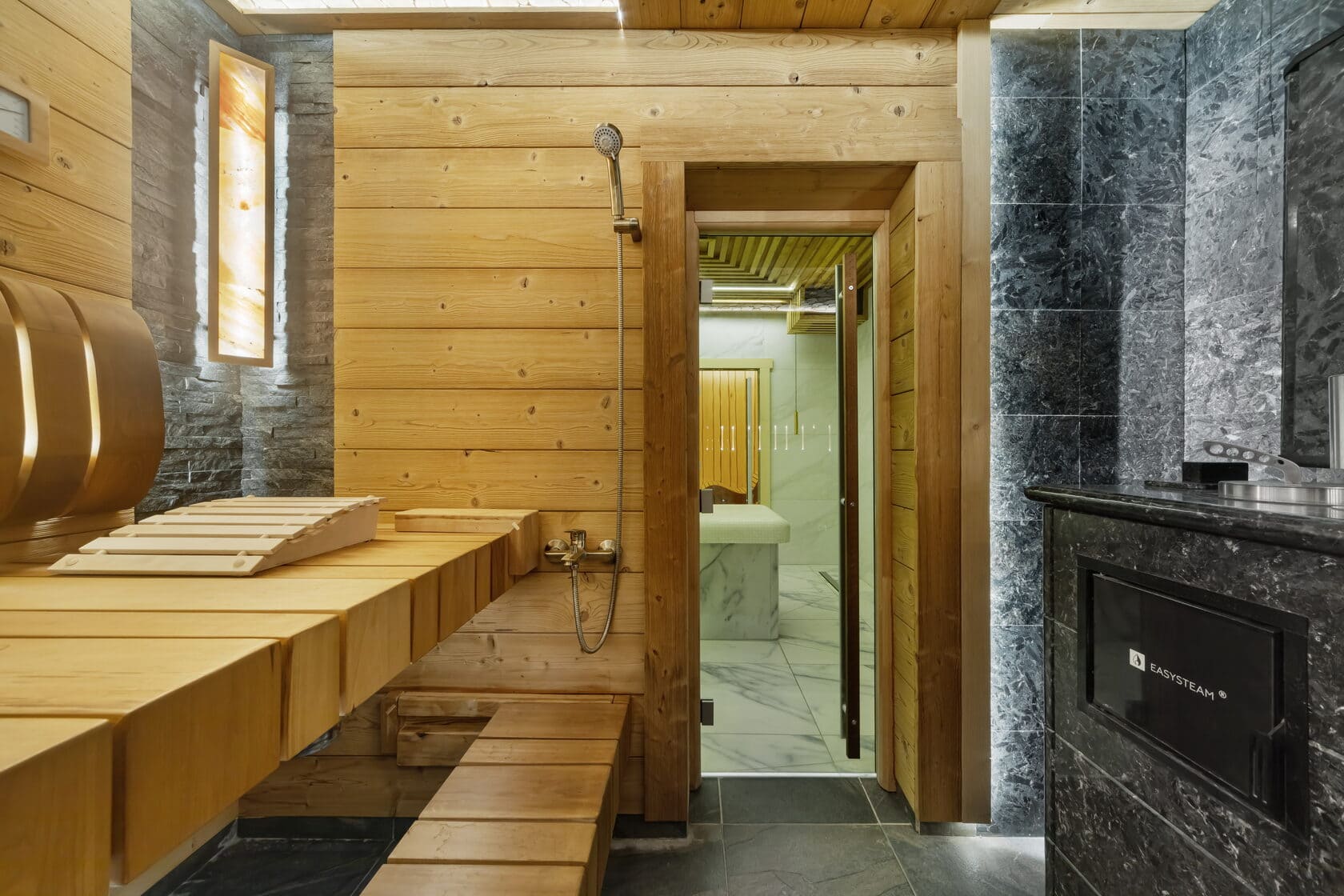 Парная с отделкой из слэба липы с корой, печью GFS и природными акцентами из можжевельника и гималайской соли