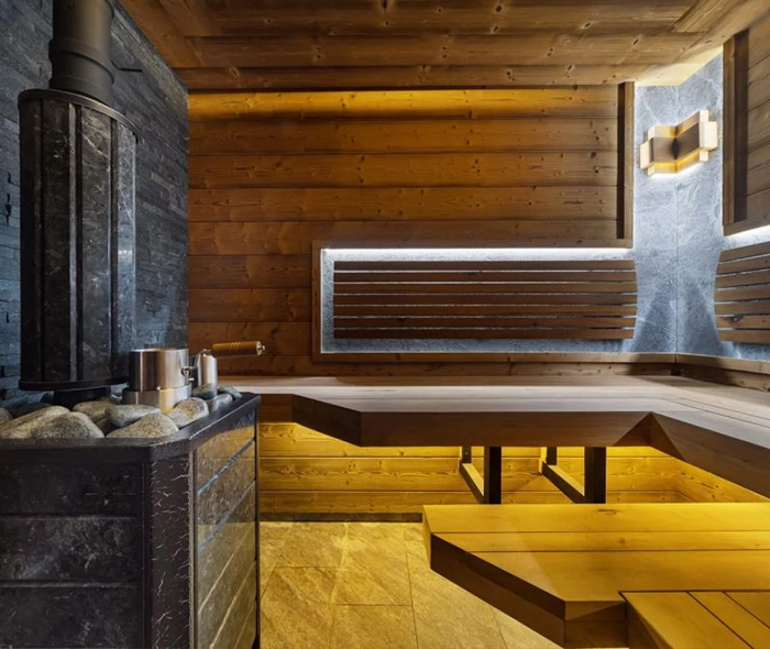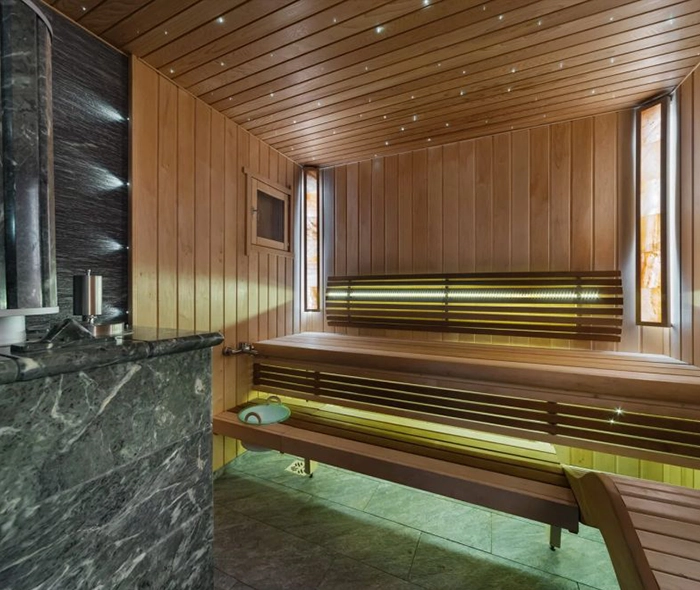 Парная с отделкой из ольхи, печью Easysystem «Сочи 2», талькомагнезитом Tulikivi и освещением «Звёздное небо»