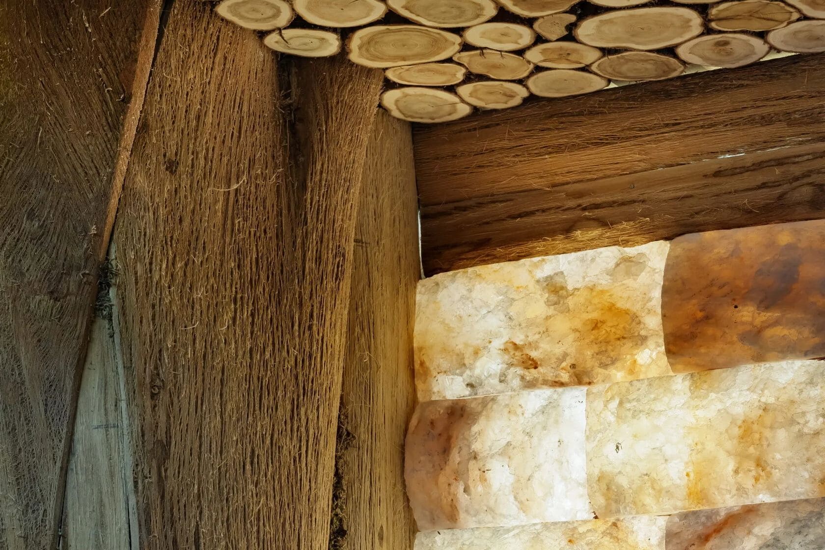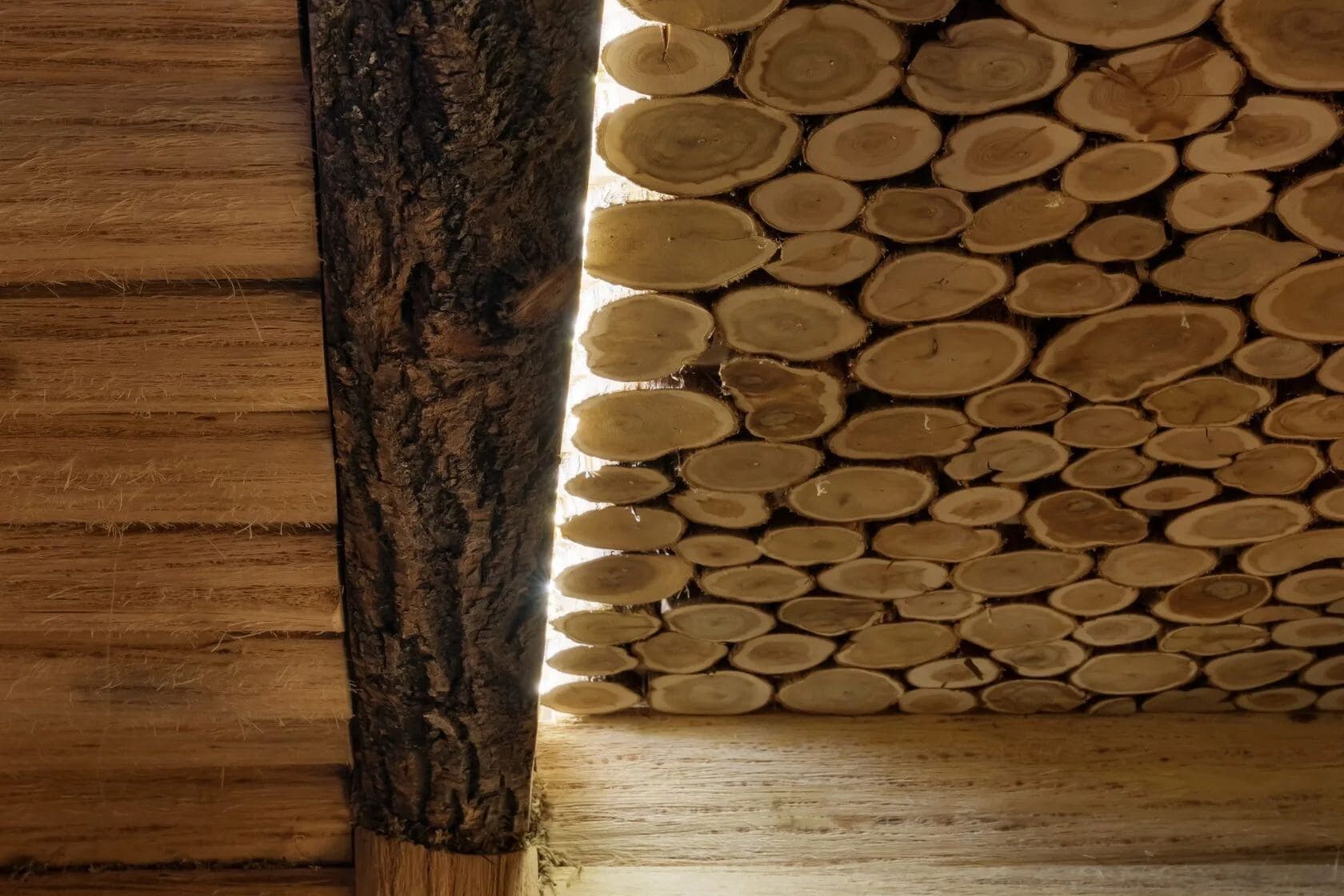 Сочетание слэба липы без коры и горбыля с лыком создаёт природную фактуру и уют
